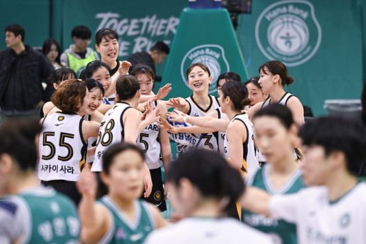 기뻐하는 KB 선수단. 사진 | WKBL |