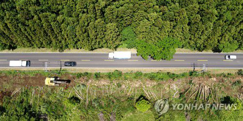 제주 비자림로 확장공사(제주=연합뉴스) 제주도가 2020년 5월 27일 비자림로 확장공사 계획 구역 중 2구간(제2대천교∼세미교차로) 1.36㎞에 대한 공사를 재개해 포크레인 등 중장비가 삼나무 벌채 작업을 하고 있다. [연합뉴스 자료사진]