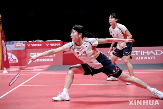 [항저우=신화/뉴시스] 백하나와 이소희가 20일(현지 시간) 중국 저장성 항저우 올림픽스포츠센터에서 열린 2025 세계배드민턴연맹(BWF) 월드투어 파이널스 여자 복식 준결승에서 중국의 류성수-탄닝 조와 경기하고 있다. 백하나-이소희 조가 2-1(15-21 21-16 21-19)로 역전승을 거두고 결승에 진출했다. 2025.12.21.