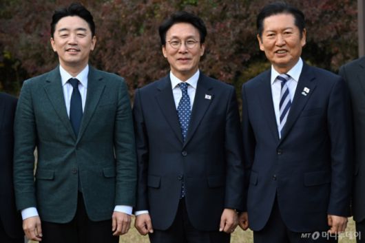 [서울=뉴시스] 배훈식 기자 = 강훈식(왼쪽부터) 대통령 비서실장과 김민석 국무총리, 정청래 더불어민주당 대표가 9일 오후 서울 종로구 국무총리공관에서 열린 고위당정협의회에 앞서 기념촬영을 하고 있다. (공동취재) 2025.11.09. photo@newsis.com /사진= |