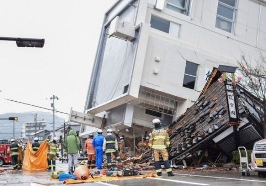 일본 소방관들이 지난 1월 3일 이시카와현 와지마 시에서 지진으로 무너진 건물을 수습하고 있다. 와지마 AFP 연합뉴스 |