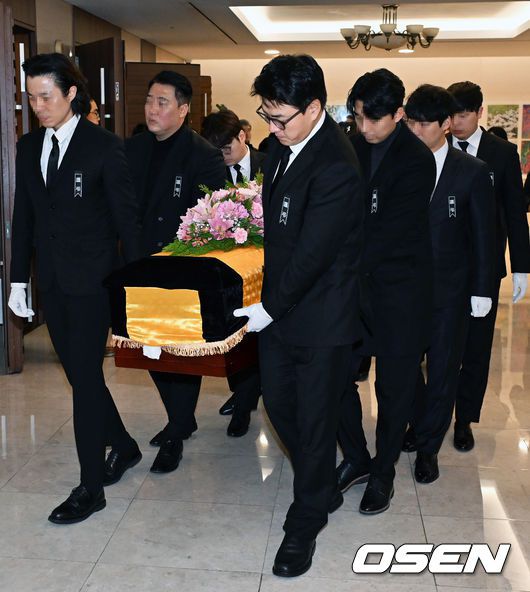 [OSEN=민경훈 기자] 배우 故 윤석화의 영결식 및 발인이 21일 오전 서울 신촌세브란스병원 장례식장에서 엄수됐다. 발인 이후 한예극장 마당에서 노제를 이어간다. 故 윤석화의 발인이 엄수된 가운데 배우 송일국이 운구를 하고 있다. 2025.12.21 /rumi@osen.co.kr