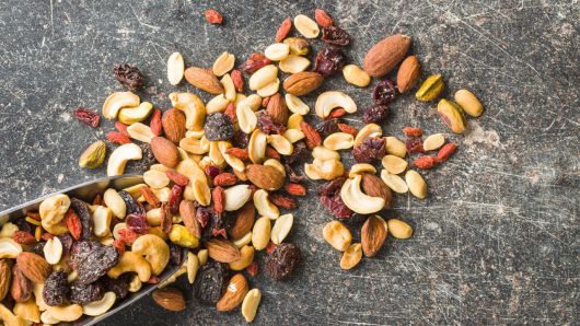 트레일 믹스는 통곡물, 견과류, 건과일 등을 섞어 만든 간식으로, 단맛과 짠맛을 동시에 만족시킬 수 있다.
