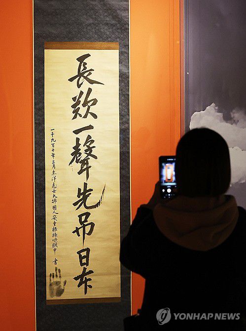 (용인=연합뉴스) 홍기원 기자 = 21일 경기도 용인시 경기도박물관에서 열리고 있는 특별전 '동양지사, 안중근-통일이 독립이다'에서 관람객들이 안중근 의사의 유묵 '장탄일성 선조일본(長歎一聲 先弔日本)'을 살펴보고 있다.