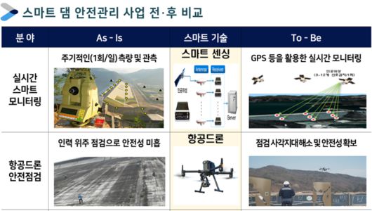 스마트 댐 안전관리 시스템은 무인기(드론), 인공지능(AI), 빅데이터, 가상모형(디지털트윈) 등의 첨단기술을 활용한다. 극한 호우나 지진 발생 시 댐의 안전성을 신속하고 정확하게 판단할 수 있는 시스템이다.