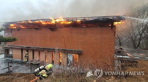 (인천=연합뉴스) 지난 20일 오전 인천시 강화군 양사면 한 교회에서 불이 나 소방 당국이 진화 작업을 벌이고 있다. 이 교회는 1893년 강화도 최초로 세워진 개신교 교회로 기독교 역사관도 마련돼 있다.2025.12.21 [인천소방본부 제공. 재판매 및 DB 금지]