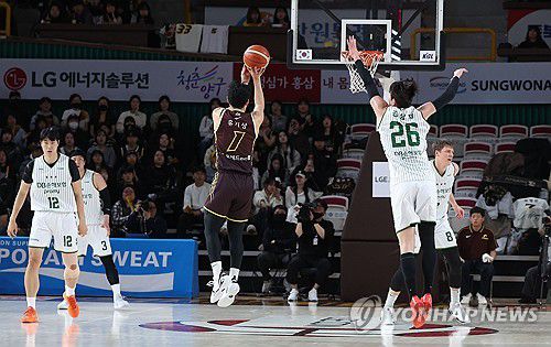 (창원=연합뉴스) 김동민 기자 = 21일 경남 창원체육관에서 열린 2025-2026 LG전자 프로농구 정규리그 창원 LG 세이커스와 원주 DB 프로미의 경기. LG 유기상이 슛하고 있다. 2025.12.21