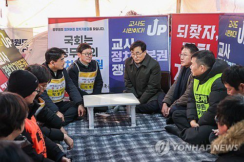 (서울=연합뉴스) 21일 전성환 대통령실 경청통합수석비서관과 배진교 국민경청비서관이 '공무원·교원 정치기본권법' 보장을 요구하며 국회 앞에서 단식 농성 중인 공무원노조 천막 농성장을 방문해 이해준 공무원노조 위원장, 박영환 전교조 위원장과 면담하고 있다. 2025.12.21 [전국공무원노조 제공. 재판매 및 DB 금지]