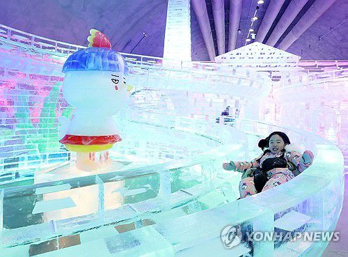 (화천=연합뉴스) 양지웅 기자 = 21일 강원 화천군 화천읍 서화산터널에 조성된 실내얼음조각광장에서 한 어린이가 아빠와 함께 얼음 썰매를 타고 있다.