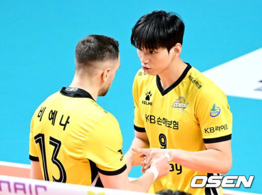 [OSEN=장충, 최규한 기자] 21일 서울 장충체육관에서 ‘진에어 2025~2026 프로배구 V리그’ 남자부 우리카드와 KB손해보험의 경기가 열렸다. 홈팀 우리카드는 6승 9패 승점 19, 방문팀 KB손해보험은 8승 8패 승점 25를 마크하고 있다. 1세트, KB손해보험 임성진과 비예나가 대화를 나누고 있다. 2025.12.21 / dreamer@osen.co.kr