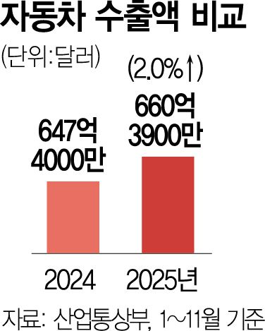 미국 수출은 올 들어 25% 관세 부과에 11월까지 14.2% 감소했으나 한미 관세 협상 타결로 15%로 세율이 낮아진 지난달에는 전년 동월 대비 5.1% 증가한 26억 9000만 달러를 기록하며 월간 기준 9개월 만에 상승 전환했다. 자동차 전체 수출액은 2%가량 늘었지만 수출 대수는 11월까지 249만 1430대로 지난해보다 1.6% 줄었다.