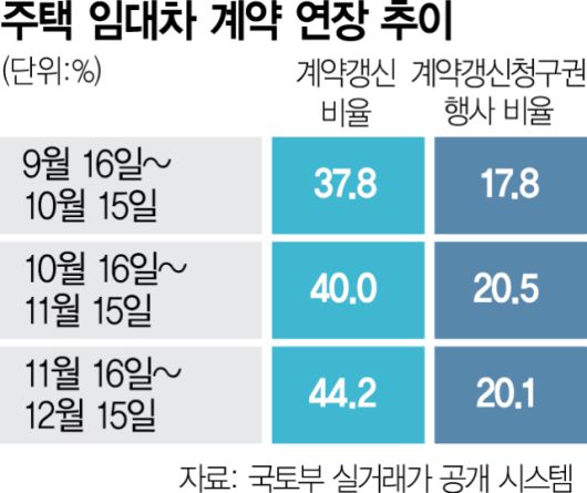 임차인이 임대인에게 추가 2년 거주를 요구할 수 있는 계약갱신청구권 행사 비중도 함께 늘었다. 대책 발표 전인 9월 16일부터 10월 15일까지는 전체 계약 중 갱신청구권을 행사한 계약이 17.8%였으나 10월 16일부터 12월 15일까지는 20.3%로 증가했다.