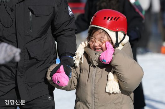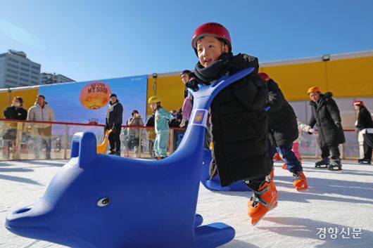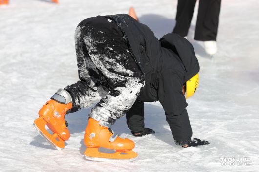 21일 서울 중구 서울시청 광장 스케이트장을 찾은 어린이가 넘어지려고 하고 있다. 정효진 기자 |