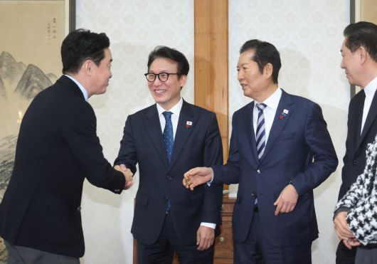 김민석 국무총리가 21일 종로구 삼청동 총리공관에서 열린 고위당정협의회에서 참석자들과 인사하고 있다. 왼쪽부터 강훈식 대통령 비서실장, 김 총리, 더불어민주당 정청래 대표와 김병기 원내대표. 연합뉴스 |