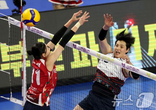 (서울=뉴스1) = 21일 화성실내체육관에서 열린 진에어 2025-26 V-리그 프로배구대회 현대건설과 기업은행의 경기에서 현대건설 김희진이 공격을 시도하고 있다. (현대건설 배구단 제공. 재판매 및 DB 금지) 2025.12.21/뉴스1pjh2580@news1.krCopyright ⓒ 뉴스1. All rights reserved. 무단 전재 및 재배포, AI학습 이용 금지.