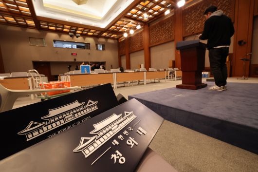 대통령실 청와대 이전이 진행 중인 21일 서울 종로구 청와대 부속 건물 춘추관 브리핑룸에 업무표장이 놓여 있다. 대통령 집무실 이전은 이달 말 마무리될 예정이며, 대통령실의 공식 명칭도 ‘청와대’로 복귀할 것으로 보인다.
