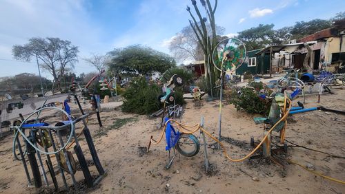 이스라엘과 팔레스타인의 접경 지역인 니르오즈에 위치한 유치원에서 파괴된 놀이기구가 방치돼 있다. [니르오즈 = 김규식 기자] |