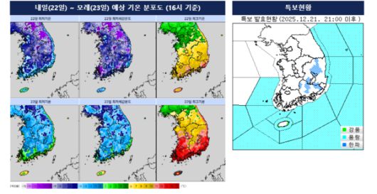 내일 아침(22일)까지는 평년(최저 -9도~2도, 최고 3도~10도)과 비슷하거나 조금 낮은 기온 분포가 이어질 것으로 보인다. 특히 전국 내륙을 중심으로 아침 최저기온이 -5도 안팎에 머물겠으며, 일부 강원내륙과 산지에서는 -10도 안팎까지 떨어질 전망이다. 남부지방도 내일 아침 기온이 오늘(21일)보다 5도~10도가량, 일부 경상권 내륙은 10도 이상 크게 낮아진다. 이에 따라 일부 경상권 내륙에는 21일 오후 9시를 기해 한파특보가 발표됐다. 낮 최고기온은 3도~12도에 이를 것으로 보인다.