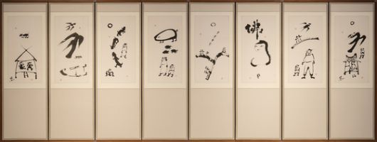 양주시립장욱진미술관의 ‘번지고 남아있는: 장욱진 먹그림’에 전시된 8폭 병풍. 장욱진의 먹그림으로 만들었다. [사진 양주시립장욱진미술관] |