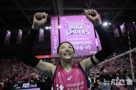 [인천=뉴시스] 정병혁 기자 = 8일 인천 부평구 삼산월드체육관에서 열린 2024-2025 V-리그 여자부 챔피언결정전(5전 3선승제) 5차전 흥국생명 핑크스파이더스와 정관장 레드스파크스의 경기에서 승리해 통합 우승을 차지한 흥국생명 김연경이 두손을 번쩍들고 있다. 2025.04.08. jhope@newsis.com |