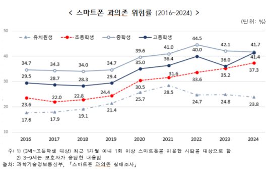 한국에서도 청소년 10명 중 4명이 스마트폰 과의존 위험군에 속할 만큼 SNS 중독이 심각하다. 국가데이터처(옛 통계청)가 발표한 ‘아동·청소년 삶의 질 2025’ 보고서에 따르면 10대 아동·청소년의 스마트폰 과의존 위험군 비율은 2016년 30.6%에서 지난해 42.6%로 증가했다. 나이별로 중학생의 위험군 비율이 41.7%로 가장 높았고, 이어 고등학생(41.4%), 초등학생(37.3), 유치원생(23.8%) 순으로 나타났다. 초·중·고교에서는 모두 10명 중 4명 꼴이다.