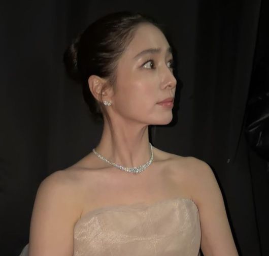 사진 속 이민정은 베이지 색 드레스를 입고 있다.