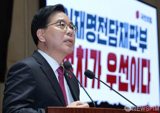[서울=뉴스핌] 윤창빈 기자 = 송언석 국민의힘 원내대표가 22일 서울 여의도 국회에서 열린 의원총회에서 모두발언을 하고 있다. 2025.12.22 pangbin@newspim.com |