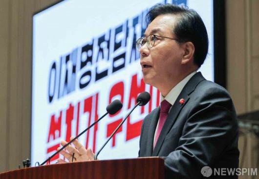 [서울=뉴스핌] 윤창빈 기자 = 송언석 국민의힘 원내대표가 22일 서울 여의도 국회에서 열린 의원총회에서 모두발언을 하고 있다. 2025.12.22 pangbin@newspim.com