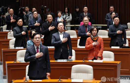 [서울=뉴스핌] 윤창빈 기자 = 송언석 국민의힘 원내대표 등 소속 의원들이=가 22일 서울 여의도 국회에서 열린 의원총회에서 국민의례를 하고 있다. 2025.12.22 pangbin@newspim.com