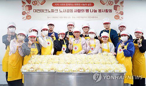 (대전=연합뉴스) 대전테크노파크 임직원들이 지난 19일 오후 대한적십자사 대전세종지사와 함께한 '사랑의 빵 나눔 행사'에서 기념촬영을 하고 있다. 2025.12.22 [대전테크노파크 제공. 재판매 및 DB 금지]