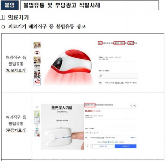 의료기기의 경우 △탈모레이저, 무좀레이저 등 의료기기 불법 해외직구 광고 226건(80%) △의료기기 광고 사전심의 위반 12건(5%) △공산품을 의료기기로 오인한 광고 21건(8%) 등 부당광고 259건을 적발했다. 반복위반 업체(11개소) 등 관할 기관에 현장점검을 요청했다.