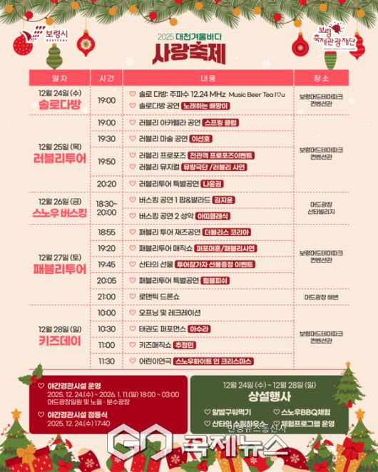 26일에는 머드광장 산타빌리지에서 감성 가득한 스노우 버스킹 데이가 펼쳐진다. 27일에는 가족 단위 관광객을 위한 패블리투어가 운영되고 저녁에는 럼블피쉬 공연과 겨울바다 위를 수놓는 로맨틱 드론쇼가 축제의 절정을 장식한다.