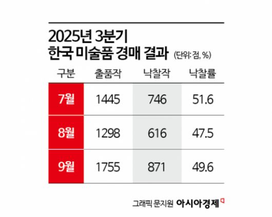 실적 지표 역시 반등을 뒷받침한다. 한국미술품감정연구센터 기업부설연구소 카이(KAAAI)가 발표한 '2025년 3분기 미술시장 분석 보고서'에 따르면 올해 3분기 국내 9개 미술 경매사의 낙찰총액은 313억5000만원으로 전년 동기 대비 31.99% 증가했다. 지난해 3분기에는 전년 대비 26.2% 감소했던 것과 비교하면 의미 있는 반전이다. 케이옥션의 낙찰총액은 163억7000만원으로 59.5% 늘었고, 서울옥션도 105억4000만원으로 23.7% 증가했다. 고가 대형 작품 거래가 실적 개선을 견인했다는 분석이 나온다.