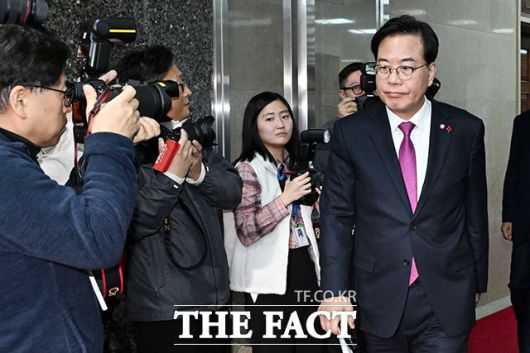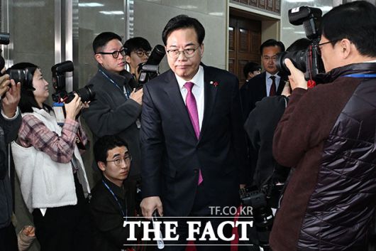 [더팩트ㅣ국회=남용희 기자] 송언석 국민의힘 원내대표가 22일 오전 서울 여의도 국회에서 본회의 개의 직전 국회의장실을 방문한 뒤 이동하고 있다.