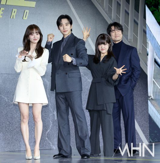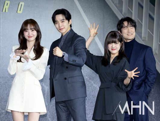 (MHN 이지숙 기자) 배우 김혜준, 이준호, 김향기, 김병철이 22일 오전 서울 강남구 웨스틴 파르나스 서울에서 열린 넷플릭스 시리즈 '캐셔로' 제작발표회에 참석해 포즈를 취하고 있다.