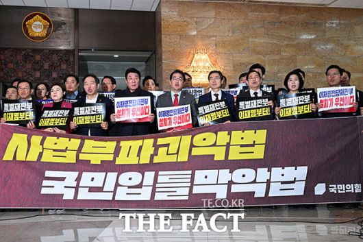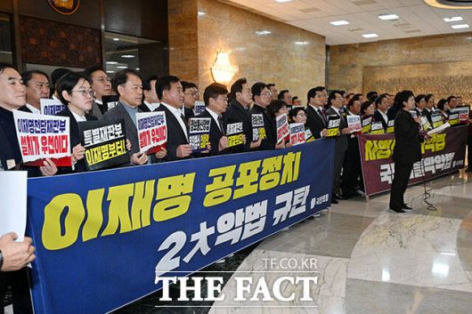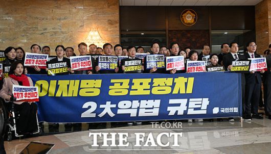 이날 국민의힘 의원들은 본회의 개의 전 규탄대회를 열고 여당이 '이재명식 공포정치 2대 악법'을 일방 처리하려 한다고 비판했다.