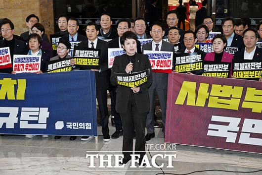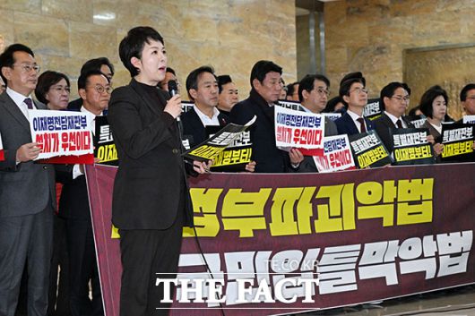 김은혜 원내정책수석부대표는 규탄사에서 "언론의 입을 틀어막고 사법부를 장악하는 모든 입법 시도는 히틀러 같은 전체주의 독재자가 늘 이용한 독재의 서막"이라며 "자신의 입맛대로 판사를 골라 내란 몰이를 하기 위한 내란특별재판부 설치를 강행하고, 임의대로 허위 정보를 규정해 언론에 막대한 손해배상을 청구하는 정보통신망법 개정을 시도하고 있다. 이는 명백한 반헌법 입법 쿠데타 시도"라고 말했다.