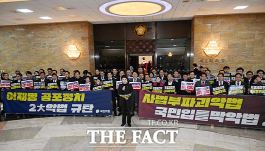 [더팩트ㅣ국회=남용희 기자] 송언석 국민의힘 원내대표를 비롯한 의원들이 22일 오전 서울 여의도 국회에서 본회의를 앞두고 '이재명 정권 사법부 파괴-국민입틀막 악법 규탄대회'를 열고 구호를 외치고 있다.