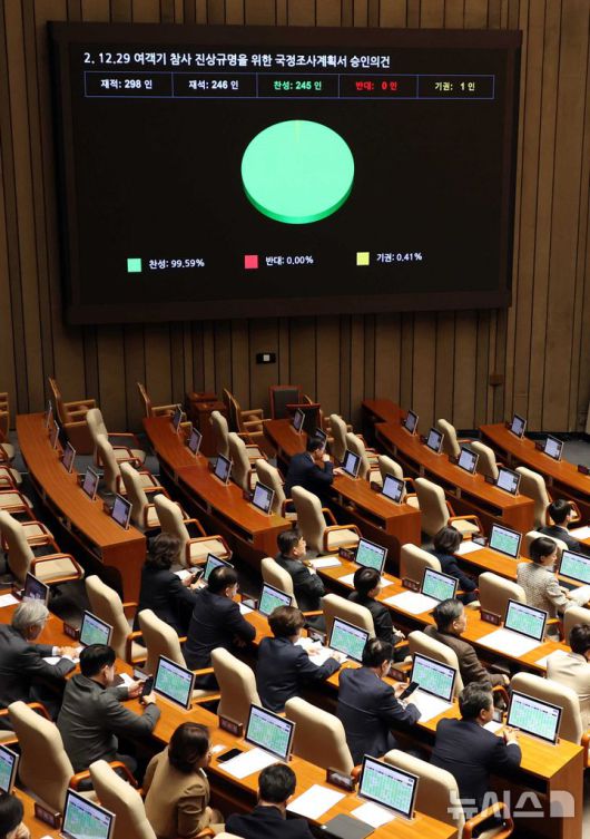 [서울=뉴시스] 조성봉 기자 = 22일 오전 서울 여의도 국회에서 열린 본회의에서 12.29 여객기 참사진상규명을 위한 국정조사계획서 승인의 건이 통과되고 있다. 2025.12.22. suncho21@newsis.com