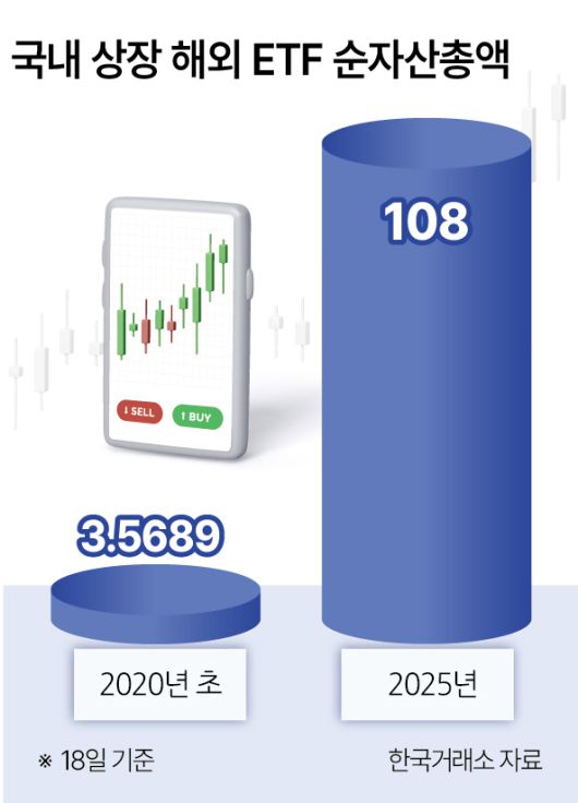 22일 한국거래소에 따르면 18일 기준 국내에 상장된 해외 자산 ETF의 순자산가치총액(AUM)은 108조원으로 집계됐다. 2020년 초 3조5689억원에서 30배 이상 불어났다.