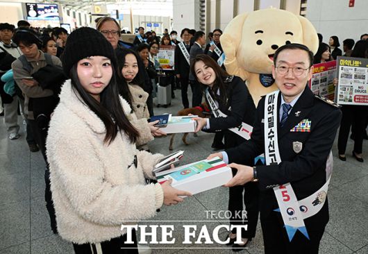 [더팩트ㅣ남윤호 기자] 이명구 관세청장(오른쪽)과 관세청 마약근절 홍보대사를 맡은 개그우먼 김승혜가 22일 오전 인천국제공항 제1여객터미널에서 '마약밀수 근절'을 위한 캠페인으로 공항 이용객에게 선물과 안내문을 전달하고 있다.