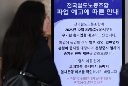 한국철도공사 전국철도노종조합의 총파업을 하루 앞둔 22일 서울역에 설치된 관련 안내문. 연합뉴스 |