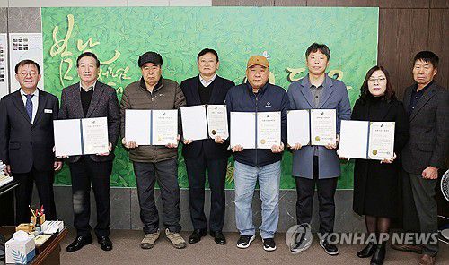(양구=연합뉴스) 22일 강원 양구군청에서 열린 이동우 축산장학회 장학금 기탁식에서 춘천철원화천양구축산농협, 양구군 강원한우축산작목연합회, 전국한우협회양구군지부, 양구두메한우영농조합, 양구양계작목반, 이자연 농업기술센터 마케팅 팀장 등 축산 관계자들이 이동우 축산장학회에 인재 양성을 위한 장학기금으로 700만 원을 기탁한 뒤 배영주 부군수와 기념 촬영하고 있다.