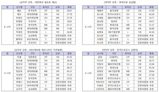 더불어 레오(현대캐피탈), 전광인(OK저축은행), 정민수(한국전력) 등의 베테랑 선수를 비롯해 한태준(우리카드), 정한용(대한항공), 이상현(우리카드) 등의 선수들도 올스타 무대를 밟게 됐다.