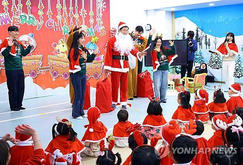 (울산=연합뉴스) HD현대중공업은 대표이사인 이상균 부회장이 22일 직장어린이집인 울산 동구 '해피보트 어린이집'을 방문해, 원아들에게 크리스마스 선물을 전달했다고 밝혔다. 이 부회장이 산타 복장을 하고 어린이들에게 인사하는 모습. 2025.12.22 [HD현대중공업 제공. 재판매 및 DB 금지]