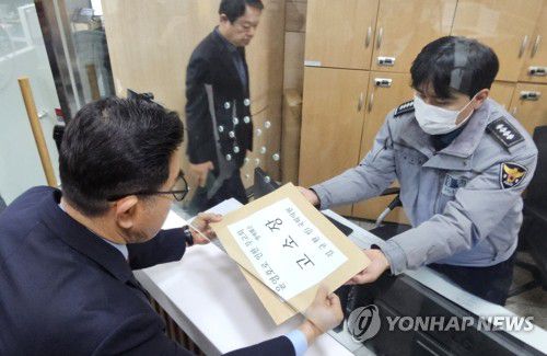 (서울=연합뉴스) 김동한 수습기자 = 김규환 전 미래통합당 의원의 대리인 장승호 씨가 22일 서울 서대문구 경찰청 민원실에서 윤영호 전 통일교 세계본부장에 대한 고소장을 제출하고 있다. 2025.12.22