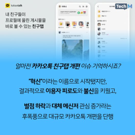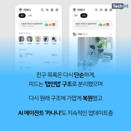 [이아령 에디터] 카카오의 카카오톡 친구탭 피드형이 이용자의 불편함을 야기한 지 약 3개월 만에 복원됐다. 이를 통해 카카오톡 내 AI 에이전트 활용도가 늘어날 경우 카카오가 궁극적인 목표로 제시한 '에이전틱 AI' 달성에 대한 기반이 마련될 것으로 기대된다.
