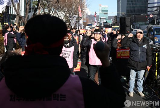[서울=뉴스핌] 최지환 기자 = 22일 오후 서울 용산구 코레일네트웍스 사무실 앞에서 열린 코레일네트웍스지부 총파업 결의대회에서 참가자들이 구호를 외치고 있다. 2025.12.22 choipix16@newspim.com