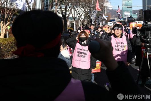 [서울=뉴스핌] 최지환 기자 = 22일 오후 서울 용산구 코레일네트웍스 사무실 앞에서 열린 코레일네트웍스지부 총파업 결의대회에서 참가자들이 구호를 외치고 있다. 2025.12.22 choipix16@newspim.com