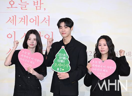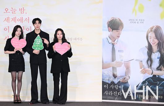 (MHN 이현지 기자) 김혜영 감독과 배우 신시아, 추영우가 22일 오후 서울 용산구 CGV용산아이파크몰에서 진행된 영화 '오늘 밤, 세계에서 이 사랑이 사라진다 해도' 언론 시사회 및 기자간담회에 참석해 포토타임을 갖고 있다.